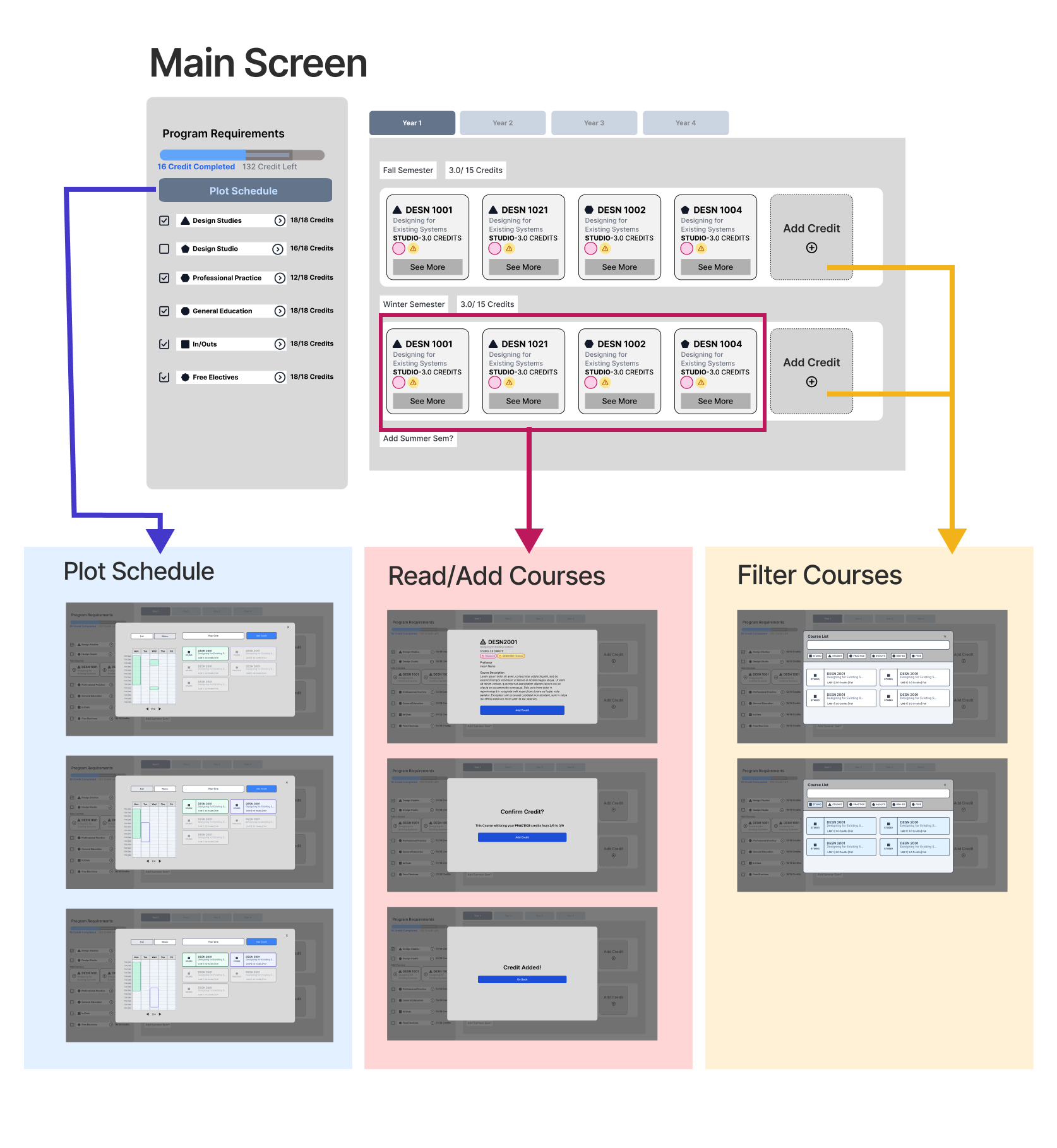 The current design journey is comprised of three separate flows- one for checking degree requirements, one for checking availability of courses, and one for plotting their timetables. This split-up system creates potential for miscommunication and a chance for students to fail to maintain degree requirements.