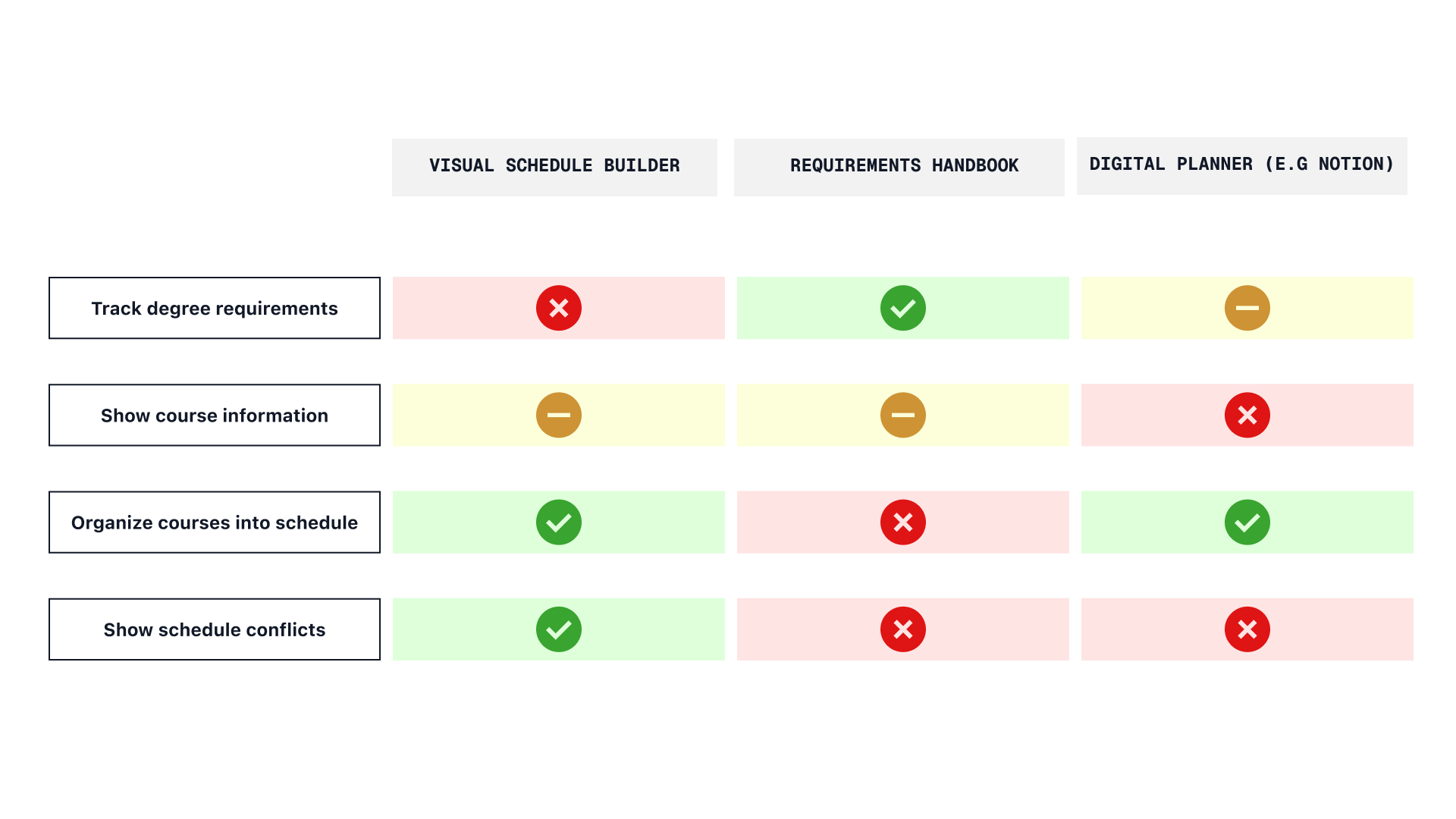 I analyzed the three most common tools design students use to plan their degrees, focusing on their strengths and weaknesses. While each app had one or two strong core features, none supported the full journey needed. This reinforced survey feedback about the frustration of switching between multiple platforms.