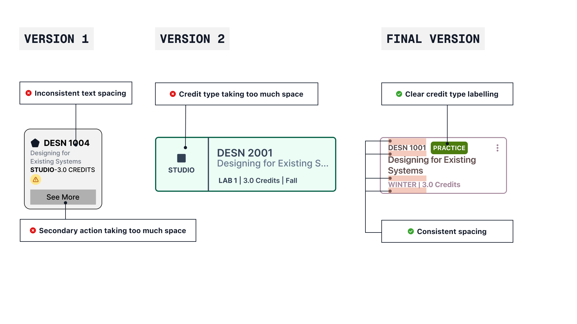 User testing showed that course cards lacked clarity and essential details, such as when a course was offered. Based on feedback, I redesigned the cards with clearer organization and added labels to show which requirements each course fulfills.